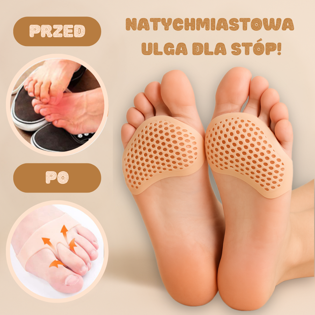 Miękka silikonowa poduszka amortyzuje każdy krok, odciąża śródstopie i chroni przed uciskiem – odciski znikają, a ból stóp przestaje Ci towarzyszyć.